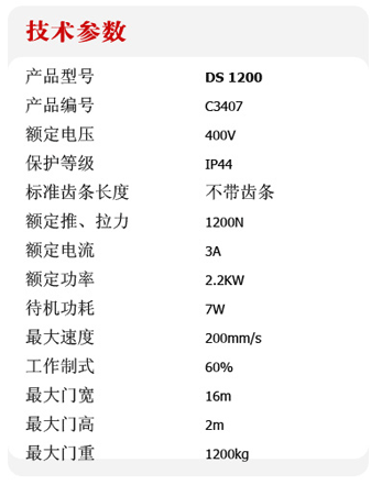 超大動力、應用廣泛 具備超強動力和穩定的性能,被廣泛應用於大型的 工業平移門 檢測嚴格、確保安全 產品經多項檢測和認證,確保用戶在使用過程中的安全 德國製造,締造完美生活空間 |